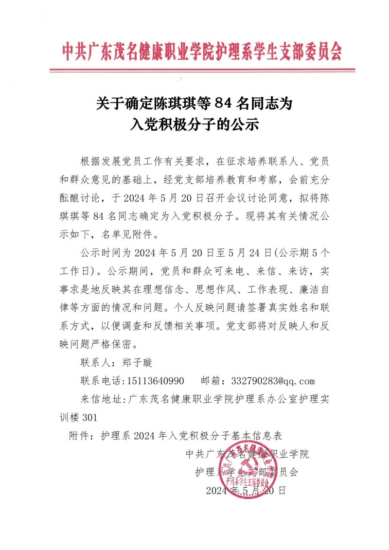 关于确定陈琪琪等 84 名同志为入党积极分子的公示