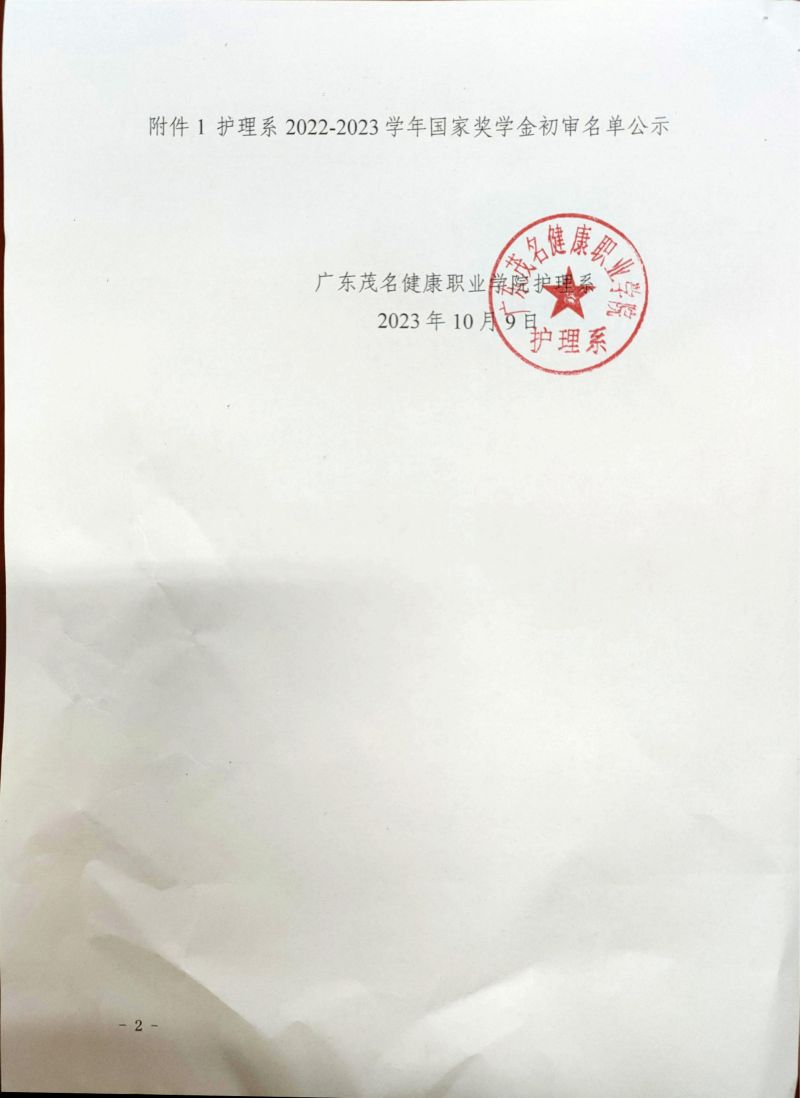 关于护理系2022-2023学年学生国家奖学金初审名单的公示
